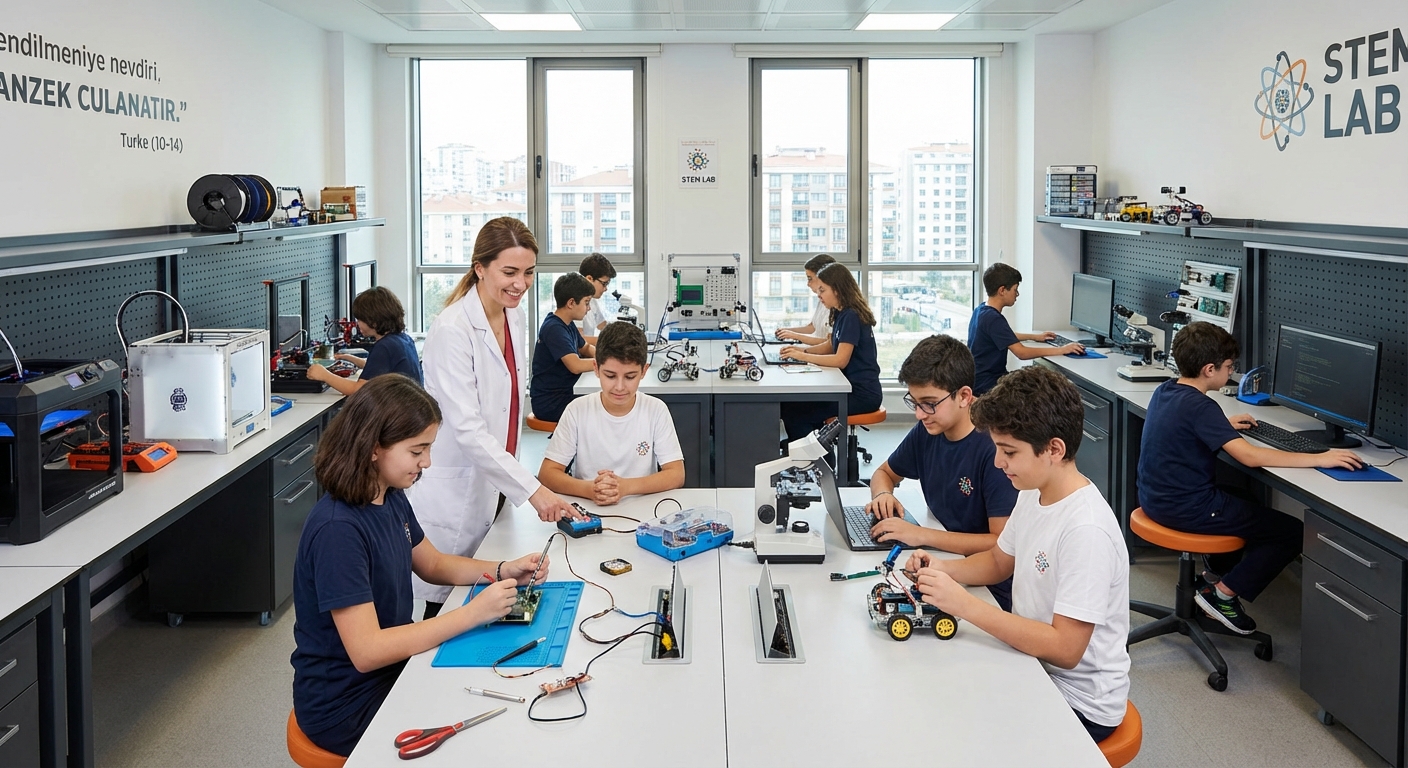 Bilişim Koleji, öğrencilerini 21. yüzyılın gerektirdiği yetkinliklerle donatmak amacıyla STEM eğitimine disiplinlerarası ve proje tabanlı bir yaklaşım getirmiştir. Öğrencilerimiz, sadece teorik bilgi edinmekle kalmaz; aynı zamanda fen, teknoloji, mühendislik ve matematik disiplinlerini bir araya getiren deneysel atölyelerde aktif olarak yer alır. Sınıflarımız, 3D yazıcılar ve robotik kitler gibi ileri teknoloji araçlarla donatılmıştır. Bu sayede öğrenciler, karşılaştıkları problemleri yaratıcı çözümlerle ele alma, analitik düşünme ve takım çalışması becerilerini üst düzeye çıkarma fırsatı bulur. Programımız, onların karmaşık problemlere çözüm üretebilen, üretken ve teknolojiye hakim bireyler olarak yetişmesini sağlamayı hedeflemektedir.
